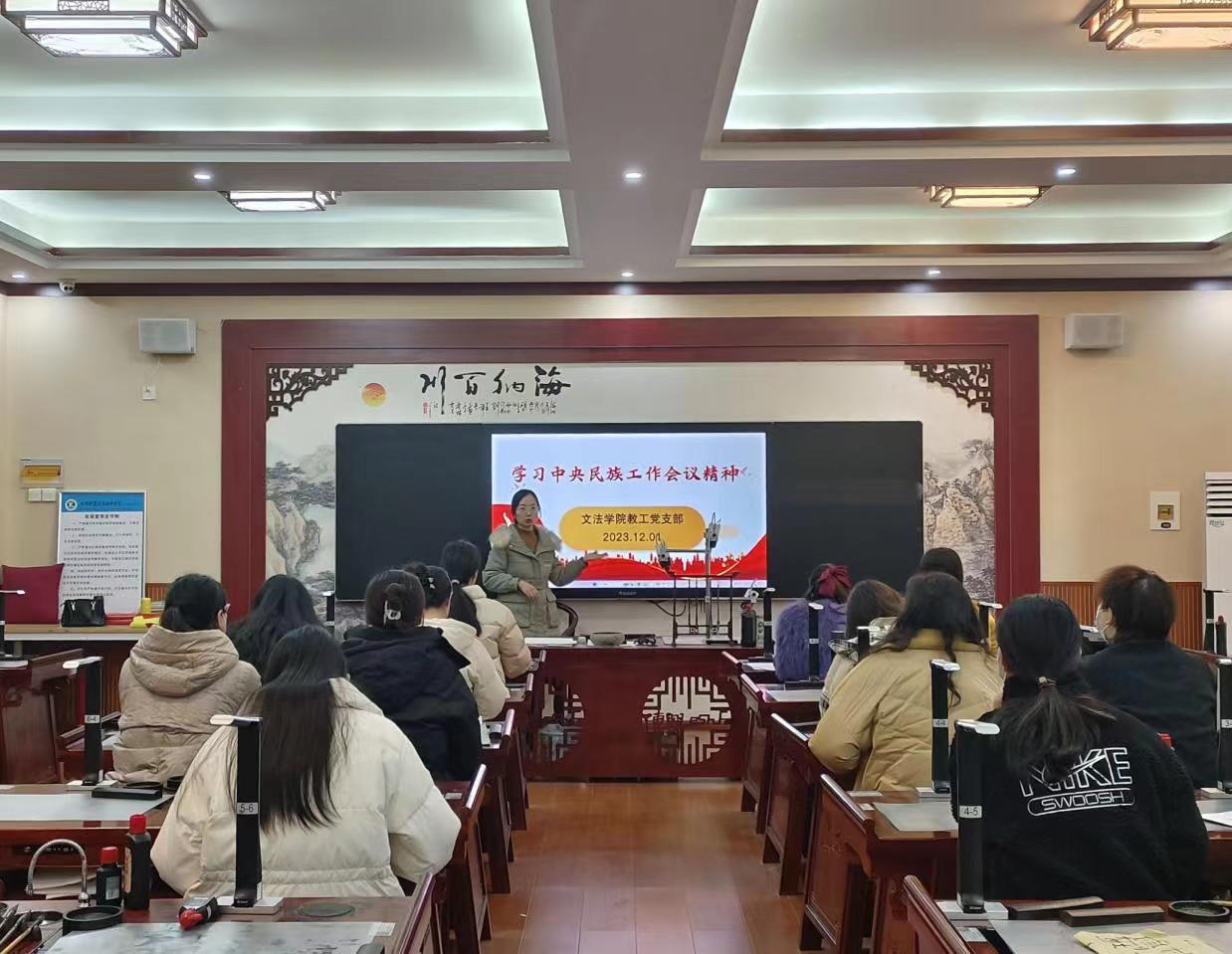 为全面贯彻习近平总书记关于加强和改进民族工作的重要思想,12月1日,文法学院教工党支部书记、副院长罗艳娟以“学习中央民族工作会议精神”为专题在学院楼B319为支部党员讲授党课。本次党课由组织委员张心巧主持,我院教工党支部全体党员参加。