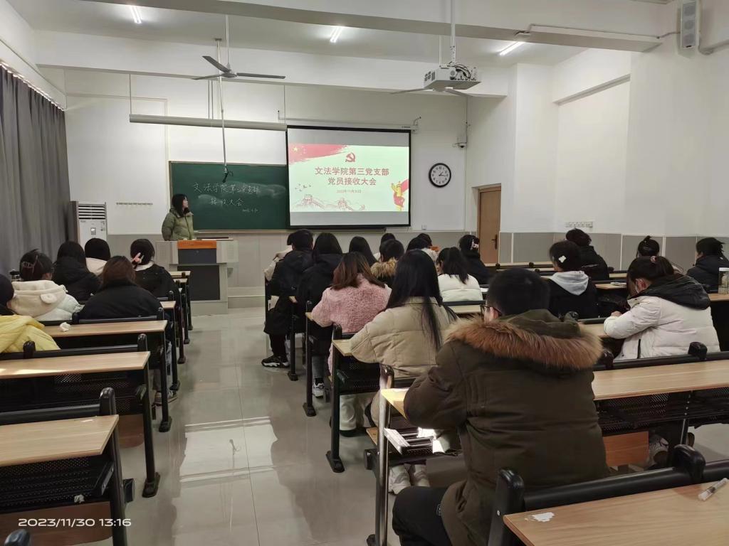 我院第三党支部于2023年11月30日中午在学院楼1-B213召开接收预备党员大会,讨论接收卢习萍等11位发展对象为预备党员的问题。本次会议由支部书记张琦主持,第三党支部全体党员及预备党员参加。