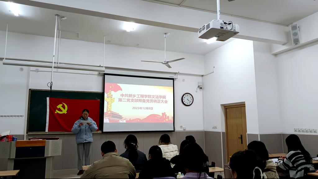 文法学院第二党支部于2023年12月6日下午在学院楼1-B214教室召开预备党员转正大会,讨论决定是否批准远晨瑶同志的转正申请。文法学院第二党支部全体党员出席会议。