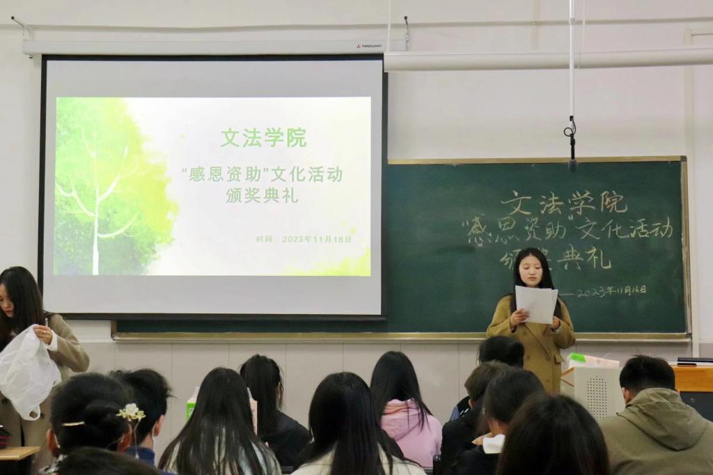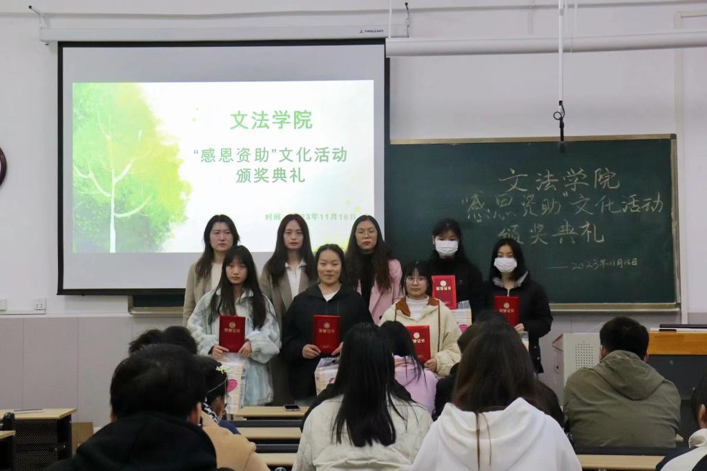 为深入贯彻国家资助政策,深化资助育人体系,落实立德树人的根本任务,激励广大受助学生奋发自强、成长成才,让更多的学生能够顺利接受高等教育,实现自我价值,并为社会和国家发展作出贡献。文法学院于11月16日中午在学院楼1-B208举行“感恩资助”系列活动颁奖典礼。