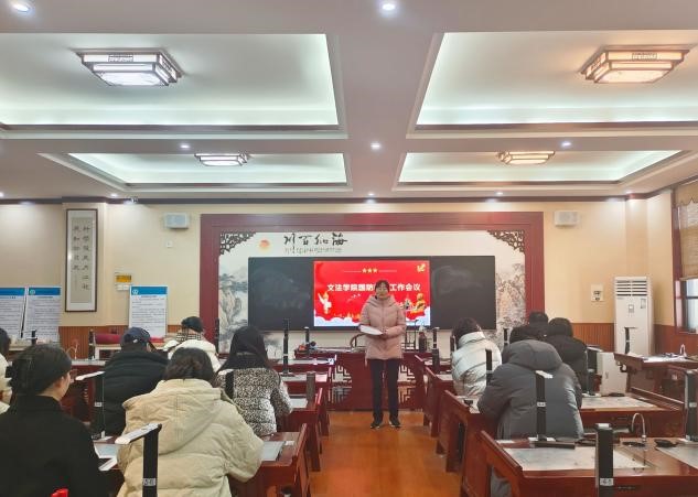 为深入学习贯彻党的二十大精神,弘扬爱国主义精神,进一步深化全民国防教育,增强全民国防意识,充分发挥高校主阵地作用,文法学院于1月3日下午在学院楼B-319组织召开国防教育工作会议。会议由文法学院党委副书记刘松梅主持,文法学院全体辅导员参加。此次会议明确成立文法学院2024年征兵工作领导小组,并确定了刘松梅为领导小组组长、文法学院全体辅导员为小组成员。