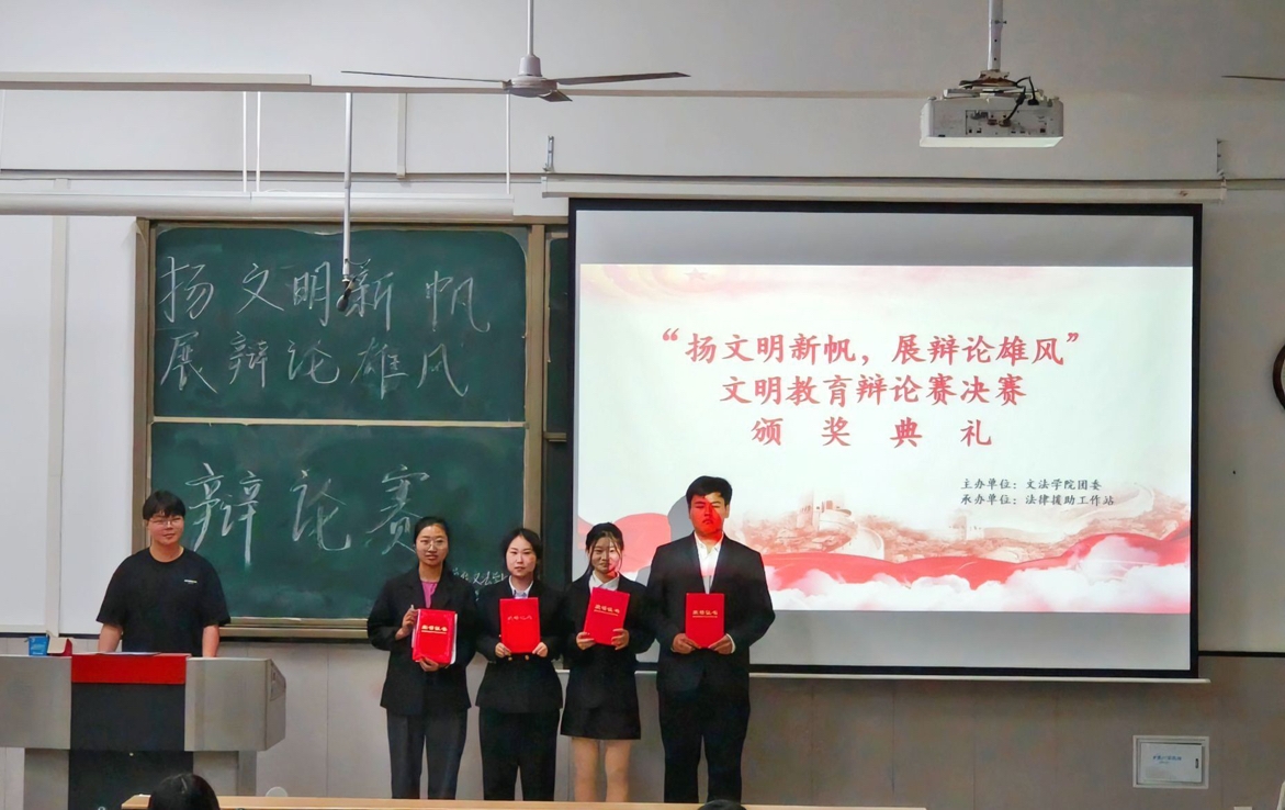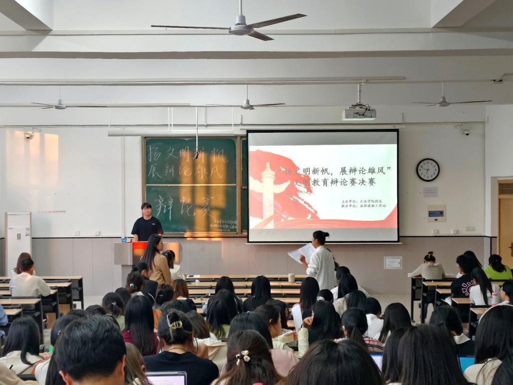 为深入贯彻落实社会主义核心价值观,全面推进学生基础文明教育,培养文明新风尚,提高学生文明素质,强化同学们对中国特色社会主义道路、理论、制度、文化的思想认同、理论认同和情感认同,文法学院于4月23日在学院楼组织开展以“扬文明新帆,展辩论雄风”为主题的辩论赛决赛。经过初赛和复赛的重重筛选,最终共有六支队伍晋级决赛。