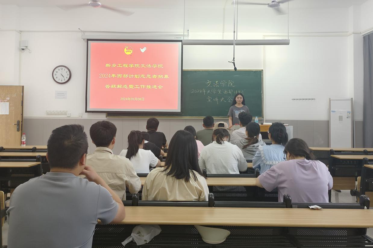 为深入贯彻习近平新时代中国特色社会主义思想,积极响应国家号召,切实做好大学生志愿服务西部计划工作,大力支持西部地区的发展,激发同学们投身西部、服务基层的热情和决心,文法学院于5月8日下午在学院楼B208举办2024年西部计划志愿者招募答疑解惑暨工作推进会。本次会议由张青老师主持,报名西部计划和乡村振兴的毕业生参与。