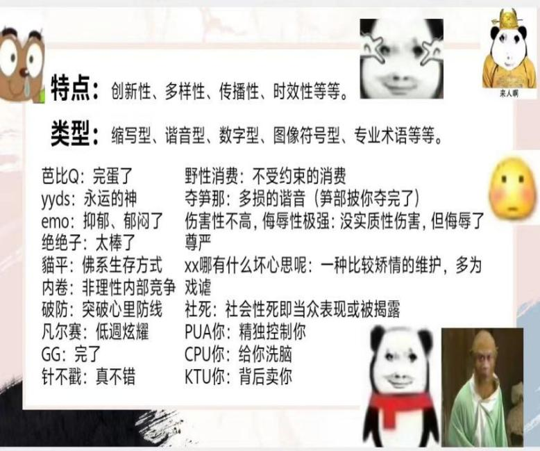 网络流行词语是指在互联网环境中产生和广泛使用的一些特殊词汇或短语。随着信息技术的发展和人们物质文化生活的日益提高,网络流行词语在真实的语言生活中得到了充分的体现。逐渐成为一种特有的文化现象,对语言文化产生了巨大的冲击。语言文化是中国艺术的宝贵财富,是中国文化的结晶。因此,在网络词语发展的大背景下我们应该积极面对各种挑战,从而推动语言文化的健康发展。