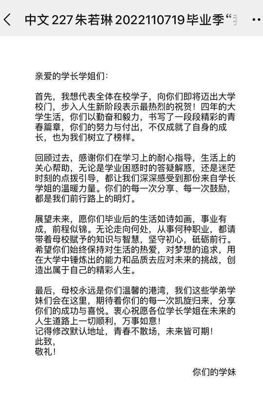 在“我想对你说”活动中,各位毕业生通过文字、照片、视频等形式,用真挚的情感,表达对老师、对同学的感激和祝福。一封封充满温情的书信,不仅记录了毕业生们成长的足迹,也传递了他们对未来的美好期许。书信中承载了深厚的感情,这份感情会跨越时空,成为永恒的记忆。
