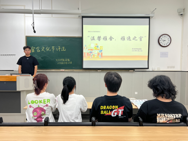 在此期间,文法学院组织了一系列相关活动。“温馨雅舍,雅逸之室”寝室评比活动为同学们提供了展现宿舍良好风采的平台,评出了院级优秀宿舍,并对宿舍进行排名再次进行复查,评选出“明星宿舍”,为其他宿舍树立标杆。“寝诉美好,悦享生活”宿舍分享活动鼓励同学们通过vlog的形式进行宿舍生活分享,以宿舍为主场景,创作贴合宿舍生活实际的日常生活情景,增进同学们的交流和沟通,培养团队合作能力。“墨香雅舍,艺绘宿风”书法绘画大赛要求同学们以宿舍生活内容为主题,创作书法作品,并鼓励同学们用绘画作为补充,增添作品的美感。“书香满舍,共享阅读”宿舍荐书活动以个人赛的形式进行,同学们可以通过ppt的方式推荐一本自己喜欢的书,对书籍进行简要介绍,围绕自己的阅读历程和阅读心得以及书籍作者的名言,分享这本书的引人之处,激发了同学们对阅读的热忱,相互分享优秀书籍,让知识与智慧在宿舍间传递。