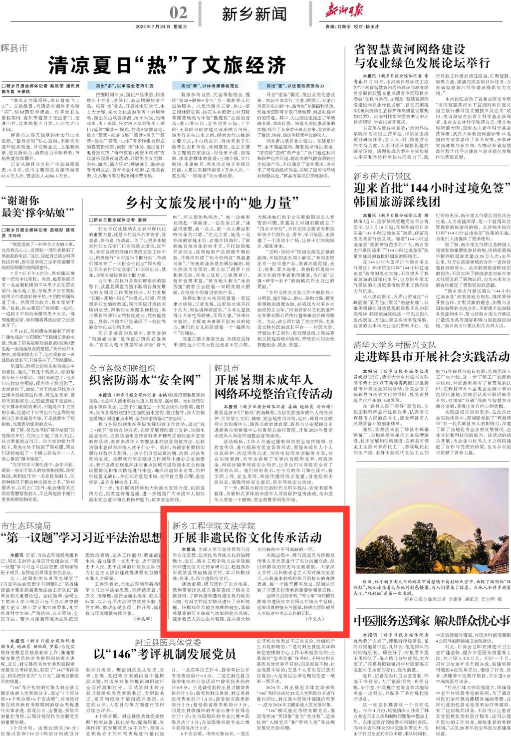 近日,我院宣传工作再传喜讯,我院暑期“三下乡”实践团队“怀梆艺韵·薪火相传”非遗民俗文化传承研习团的实践通讯稿被新乡日报报道。此次实践活动以“传承非遗民俗文化,共振时代多彩村声”为主题,旨在深入贯彻习近平总书记关于文化遗产保护的重要论述精神。这不仅展示了我院在非遗民俗文化传承方面的积极探索与实践成果,更展现了我校注重培养高素质应用型人才的育人成效。