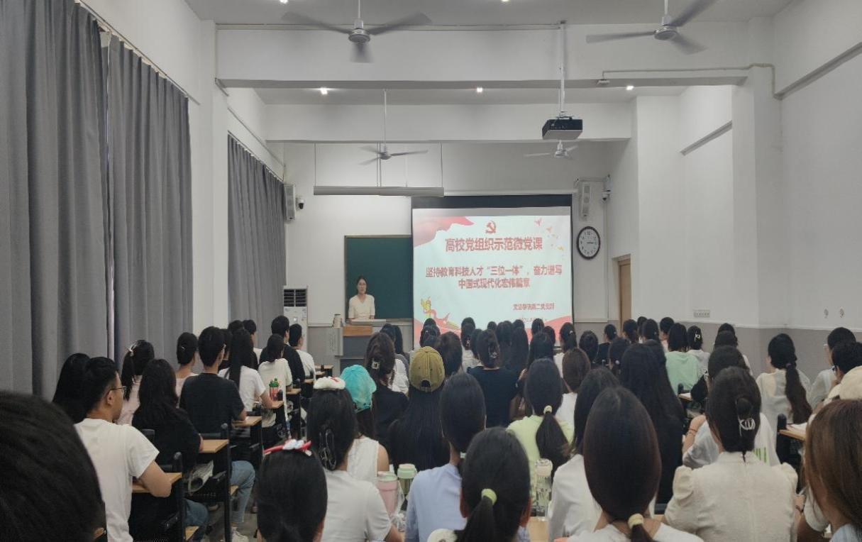 活动伊始,李荣荣老师强调此次微党课以“教育强国、科技强国、人才强国”为主题,深刻阐述“教育、科技、人才是中国式现代化的基础性、战略性支撑”的丰富内涵,深入解读推进教育、科技、人才“三位一体”协同融合发展。在李荣荣老师的带领下,全体党员认真观看学习。