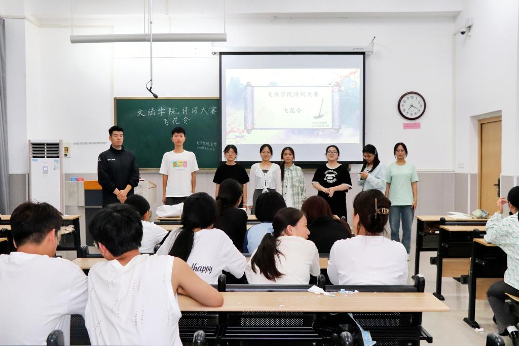 为弘扬中华优秀传统文化,展现诗词魅力,提高学生的诗词素养和思维能力,我院于9月20日晚在学院楼B108举办“飞花令”诗词大赛,活动面向全体文法学院学生。