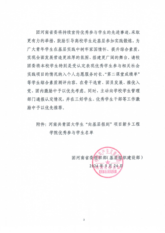 近日,共青团河南省委员会印发《关于认定2024年度河南共青团大学生“向基层报到”优秀参与学生的函》,我院冯其蕊、谭蕊、卢悦颖三名同学被团省委认定为优秀参与学生。
