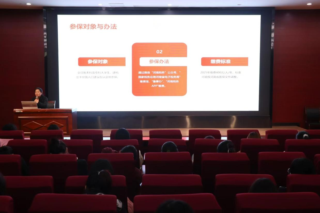 会上,市医保工作人员从参保对象与方法、缴费标准、医疗报销范围、报销比例等方面详细介绍了2025年度医保政策,重点讲解了大学生在校参保的优势和“等待期”的新政策,使大家对大学生医保有了更全面和深刻的认识。同时,市医保工作人员就参加医保的重要性从我们身边的例子做了进一步阐述,她指出,大学生正处于青春年华,但同样面临着各种健康风险,参加医保不仅可以为自己提供一份健康保障,还能在遭遇疾病时减轻经济负担,避免因病致贫、因病返贫的情况发生。在答疑环节,学生就关心的医保缴费、报销流程等问题进行提问,工作人员进行了专业且详细解答,赢得了在场学生的阵阵掌声。