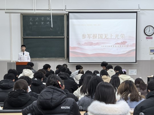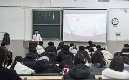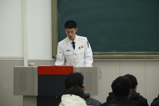 会上,解树昊结合自身经历,讲述了从青涩学生到合格军人的蜕变历程,向大家分享自己两年军旅生涯的心得感悟。随后,解树昊详细介绍了大学生应征入伍的基本条件、报名流程,以及学费减免、就业扶持等相关政策,使同学们对应征入伍有了更加全面深入的了解。在互动交流环节,同学们踊跃提问,解树昊对同学们关心的应征入伍政策要求、体检流程、政治考核等热点问题,进行了全面细致的解答,并鼓励有意向入伍的同学们携笔从戎,建功军营,把爱国之情转化为参军报国的实际行动。