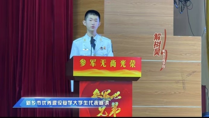 少年当使满月弓,不惧岁月不惧风。解树昊同学,选择了助力新乡市2025年度征兵工作,在新乡市军分区的组织下,参加了市退役复学优秀大学生巡回宣讲队,在各大高校巡回宣讲,分享自己的从军路,解读征兵政策,鼓励广大青年响应祖国号召,踊跃报名参军。假期利用微信群等方式为我校应征青年解答体检、政审等方面的问题。