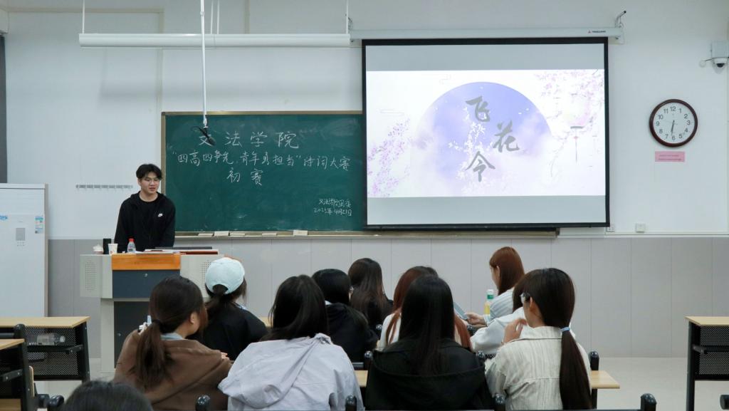 为传承中华优秀传统文化,激发青年学子的责任担当意识,展现青春风采,文法学院于4月21日晚在南校区学院楼B-213教室举办“四高四争先,青年勇担当”诗词大赛初赛,我院学生积极参与。