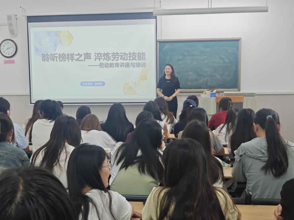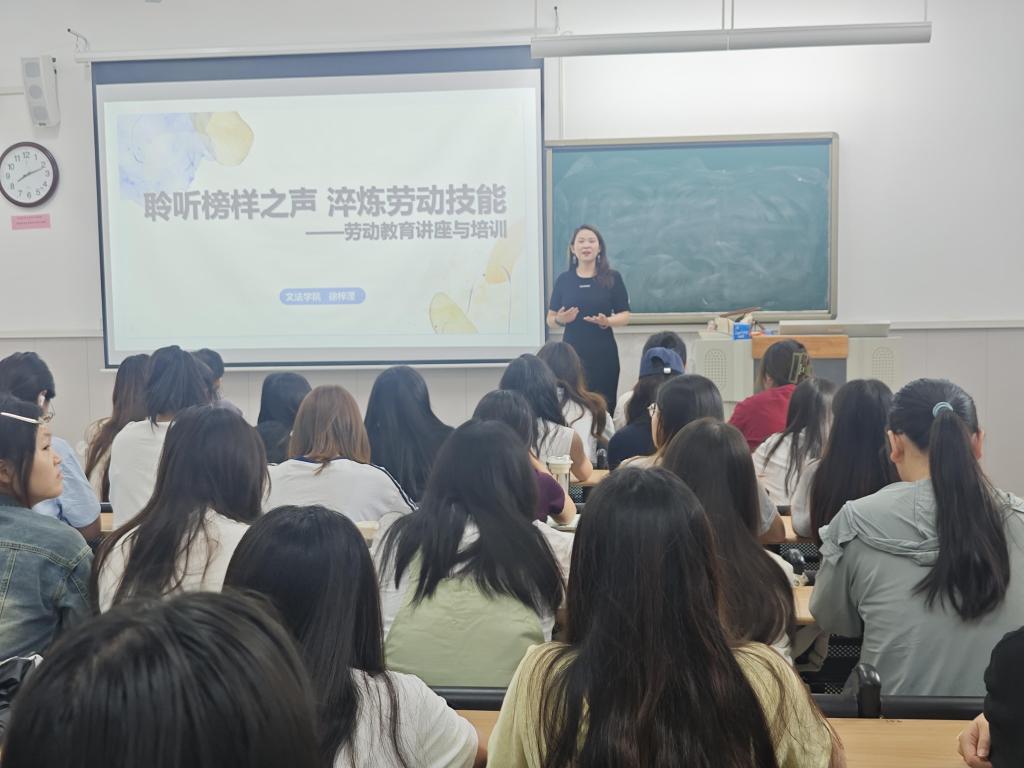 为深入贯彻落实习近平总书记关于教育的重要论述,全面贯彻党的教育方针,引导广大青年学生树立正确的劳动观念,增强劳动技能,我院于5月15日开展“聆听榜样之声,淬炼劳动技能”劳动教育讲座培训,本次讲座由我院新闻学专业徐梓滢老师担任主讲,我院学生积极参与。