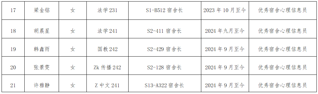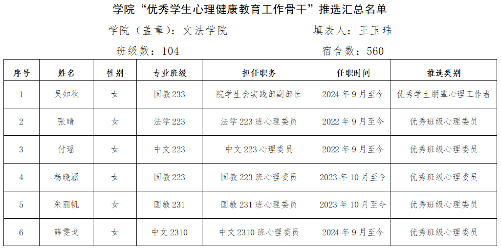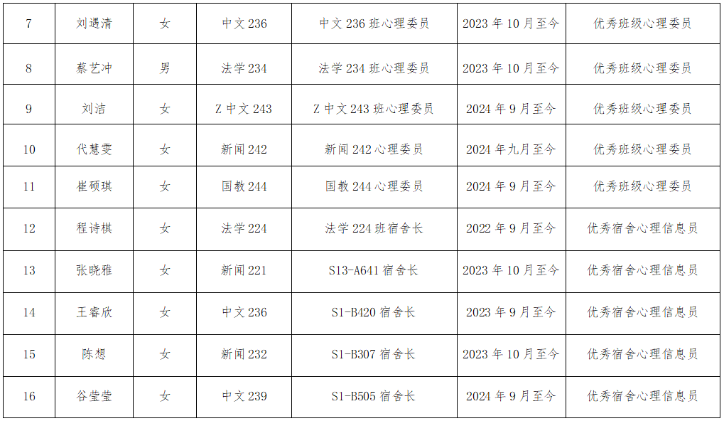 2025年4月21日-5月23日,我院开展了2025年心理健康教育工作优秀个人评选工作。本次共评选优秀班级心理委员10名,优秀宿舍心理信息员10名,优秀学生朋辈心理工作者1名。心理健康教育优秀个人评选旨在进一步加强我院心理工作建设,表彰先进,树立典型,充分发挥“学校-学院-班级-宿舍”四级心理健康教育网络的作用。
