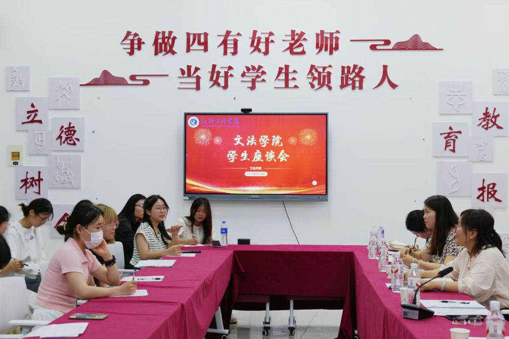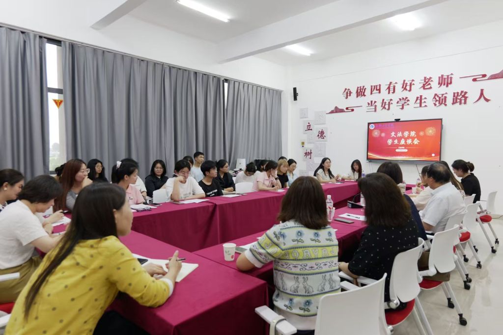为提高教学质量,优化教育管理,6月19日下午,文法学院于学院楼B-314召开学生座谈会,文法学院院长黄进才、常务副院长罗艳娟、教学助理、各教研室主任以及各级学生代表参会。