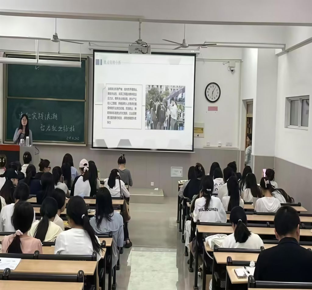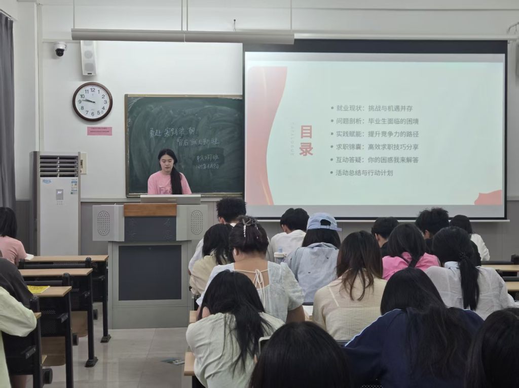 中文237班团支书以PPT讲座形式开展就业指导活动。讲座从剖析毕业生求职困境切入,围绕实践赋能提出竞争力提升路径;进而分享求职实用技巧,拆解高效求职策略;最后,通过互动答疑,现场回应同学困惑,助力同学们明晰就业方向,增强求职信心。