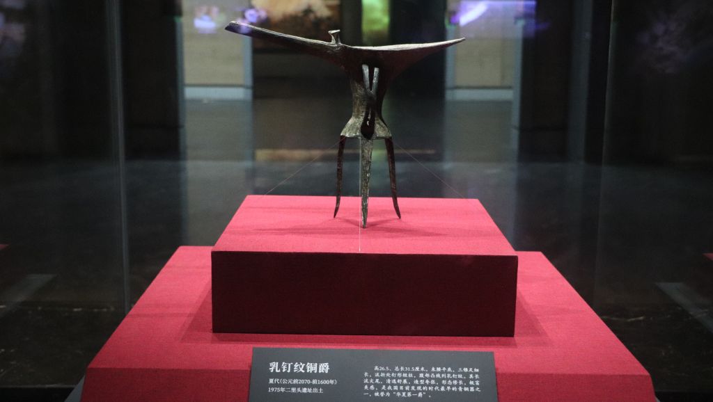 随着博物馆志愿者娓娓道来的讲解,实践团队仿佛穿越时空长廊,一幅勾勒着华夏早期文明的壮丽图景徐徐铺展。最令人驻足凝视的当属乳钉纹青铜爵,这件被誉为“天下第一爵”的器物,以轻薄精巧的器型与古朴庄重的纹饰,诉说着青铜时代的工艺巅峰。20厘米的修长身姿上,规整排列的乳钉纹与纤细的束腰设计相得益彰,虽历经三千余年岁月侵蚀,仍以傲然之姿展现着夏朝酒礼文化的独特魅力。作为二里头文化青铜铸造技艺的杰出代表,它不仅见证了华夏先民从陶器到青铜器的跨越,更承载着早期国家礼制文明的庄严密码,静默中彰显着华夏文明初创时期的雄浑气象。