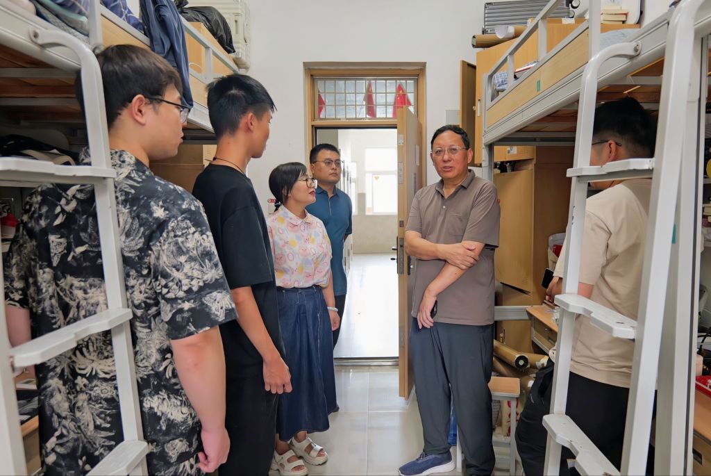 为深入了解 2025 级新生入校后的适应情况,将学院的关怀与温暖精准送达新生身边,帮助新生快速融入大学生活,8 月31日上午,文法学院院长黄进才、常务副院长罗艳娟、党委副书记张振华、团委书记李婉鑫及全体辅导员一行深入新生宿舍开展暖心慰问活动。
