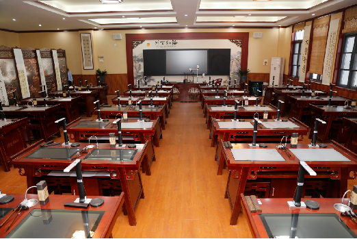 软笔书法与板书实训室:主要承担书法、书法鉴赏、教学技能训练等课程教学任务,主要包括教学直播系统、书法教学视频资源、自动笔洗系统等设施,是一个书法教学、书法交流、书法查阅和书法作品展示等的多功能现代化实训室。
