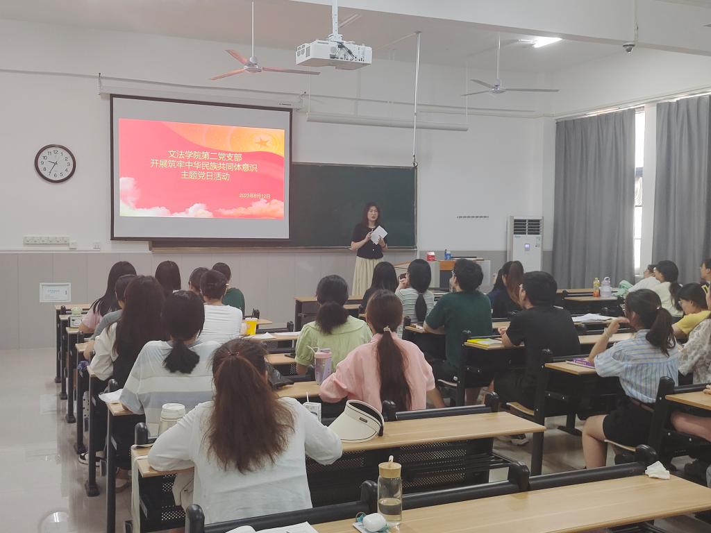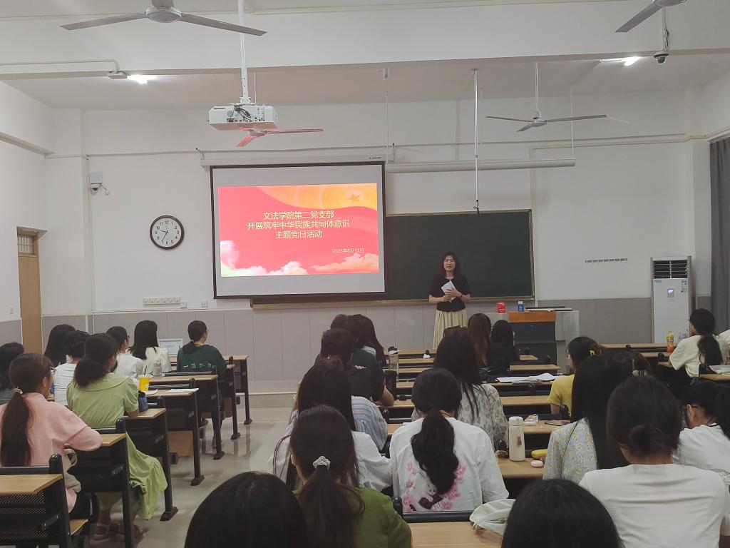 为深入铸牢中华民族共同体意识,抓牢民族团结的生命线,加强党支部成员的思想理论建设,文法学院第二党支部于2023年6月12日上午在学院楼B208教室开展“铸牢中华民族共同体意识”主题党日活动,本次活动由支部书记李婉鑫主持,第二党支部全体党员参加会议。