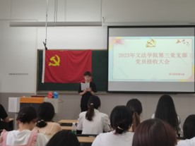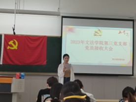 会议严格按照党支部的接收新党员的会议规定流程进行。首先,支部书记史龙繁对以上5位新同志表示热烈祝贺,接着,全体成员起立,奏《国际歌》,并按《中国共产党章程》规定,5位预备党员面向党旗郑重宣誓,最后,全体成员起立,奏国歌。接着,5名发展对象依次宣读入党志愿,汇报自己对党的认识、入党动机、以及平时学习、工作和生活中的情况以及需要向党组织说明的问题,并结合自身情况表明今后的学习和工作的态度和方向;随后,两位入党介绍人根据他们5位同志在培养期间的表现,进行了点评并提出意见,肯定了5位同志的表现,但还存在不足,希望今后加强学习,以正式党员的标准严格要求自己,以身作则,为班级,为文法学院大集体做贡献;然后,进行讨论并采取无记名投票的方式进行表决,现场公布了票决结果,5位同志均全票通过,正式成为预备党员。