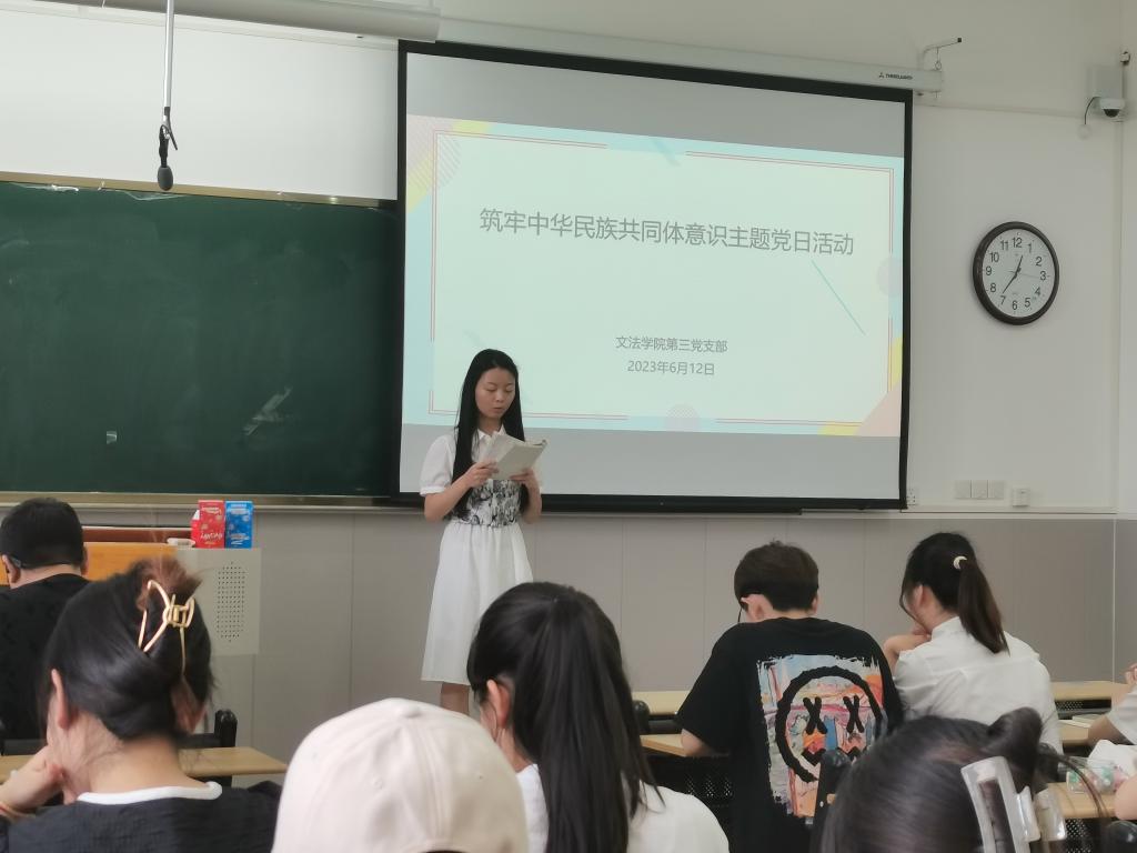 为深入学习贯彻党的二十大精神和习近平总书记在中央民族工作会议上的重要讲话精神,推动铸牢中华民族共同体意识教育,加强党支部思想建设,我院第三党支部于2023年6月12日中午在学院楼315教室开展“铸牢中华民族共同体意识”主题党日活动。本次活动由我院第三党支部书记史龙繁老师主持,我院第三党支部全部党员参加。
