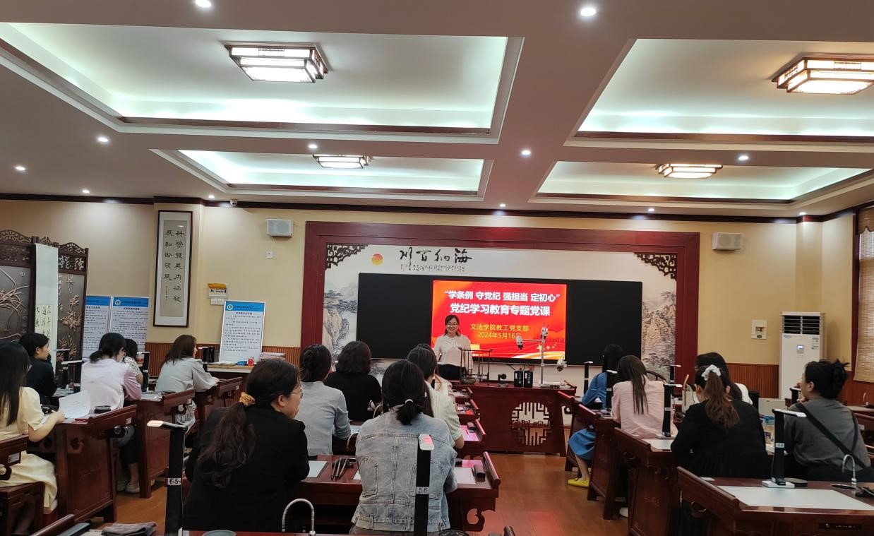 为加强党纪建设,进一步增强全体党员教师政治定力和遵纪守法意识,5月16日上午,我院教工党支部书记罗艳娟于学院楼B319主讲以“学条例 守党纪 强担当 定初心”为主题的党纪学习教育专题党课。本次党课由组织委员张心巧主持,我院教工党支部全体党员参加。
