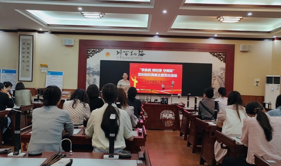 为深入学习贯彻党纪条例,落实习近平总书记关于党纪学习教育的重要讲话和指示精神,我院于5月21日在学院楼B319开展以“学条例 明纪律 守规矩”为主题的党纪知识竞赛活动。本次活动由徐梓滢老师主持,我院教工党支部党员教师参与答题活动。