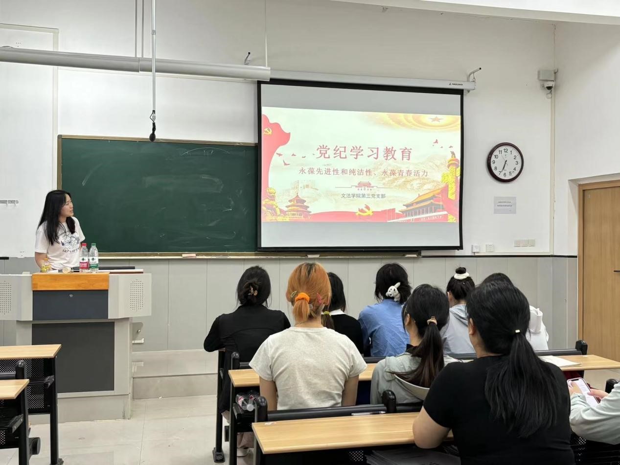 为深入学习贯彻习近平总书记关于党纪学习教育的重要讲话和重要指示精神,推动全面从严治党向纵深发展,用党纪党规校正思想和行动。5月22日,文法学院第三党支部书记张琦以“守党规,知党纪,守纪律”为题在学院楼b211教室向支部全体党员讲授党纪学习教育专题党课。