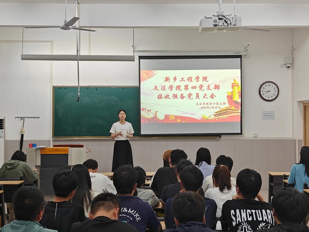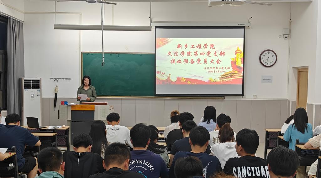 我院第四党支部于2024年5月22日晚上在学院楼1-B213教室召开接收新党员大会。本次大会由支部书记吕鹏洁主持,第四党支部全体党员及预备党员参加。