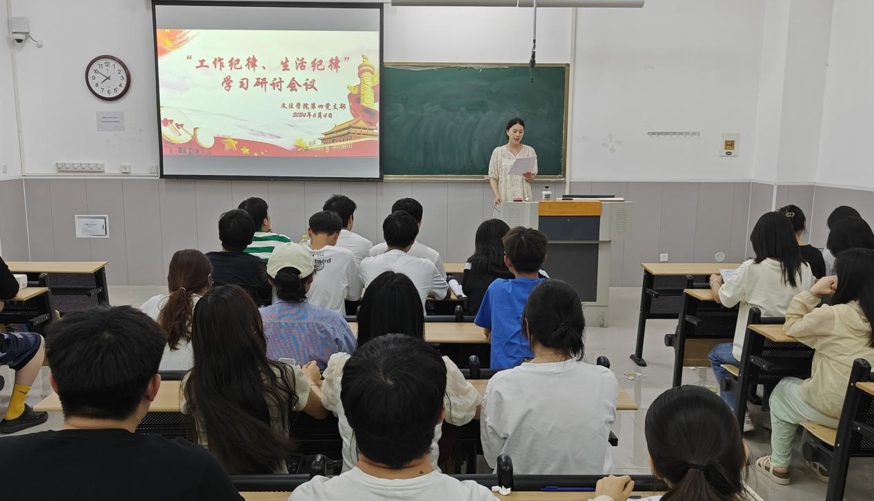 为进一步强化党员纪律规矩意识,提高政治站位和政治自觉,在工作和生活中自觉做到守纪律、讲规矩,我院第四党支部于2024年6月4日晚19:30在学院楼1-B207开展了学习党的工作纪律和生活纪律主题活动。