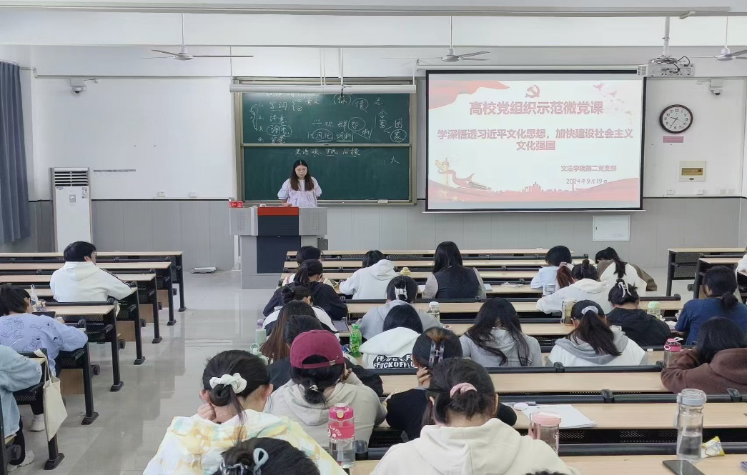 为深入学习领会习近平文化思想的深刻内涵,勇担新的文化使命,不断开创新时代中国特色社会主义文化建设新局面。文法学院第二党支部于2024年9月19日下午,开展收看“2024年高校党组织示范微党课”活动,由李荣荣老师主持,第二党支部成员全体参加。此次活动旨在引导党员深刻把握习近平文化思想的核心要义,自觉投身社会主义文化强国建设。