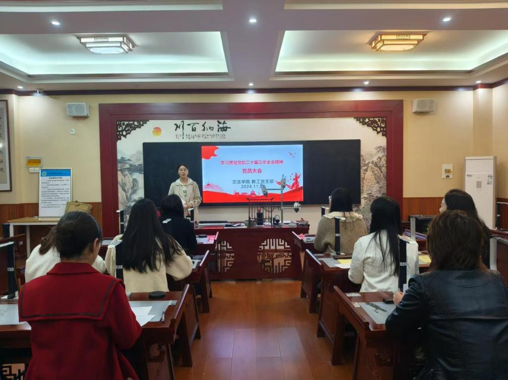 为深入学习贯彻中国共产党第二十届中央委员会第三次全体会议精神,进一步加强文法学院教工党支部建设,提高党员的政治素养,11月8日,文法学院教工党支部在学院楼书法教室B319召开党员大会,会议由教工党支部组织委员李静主持,全体教工党员参加。