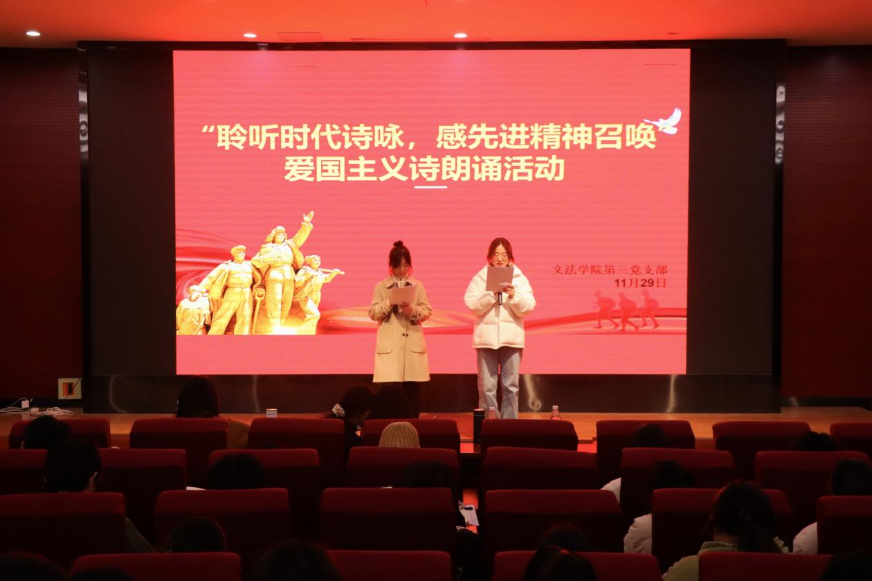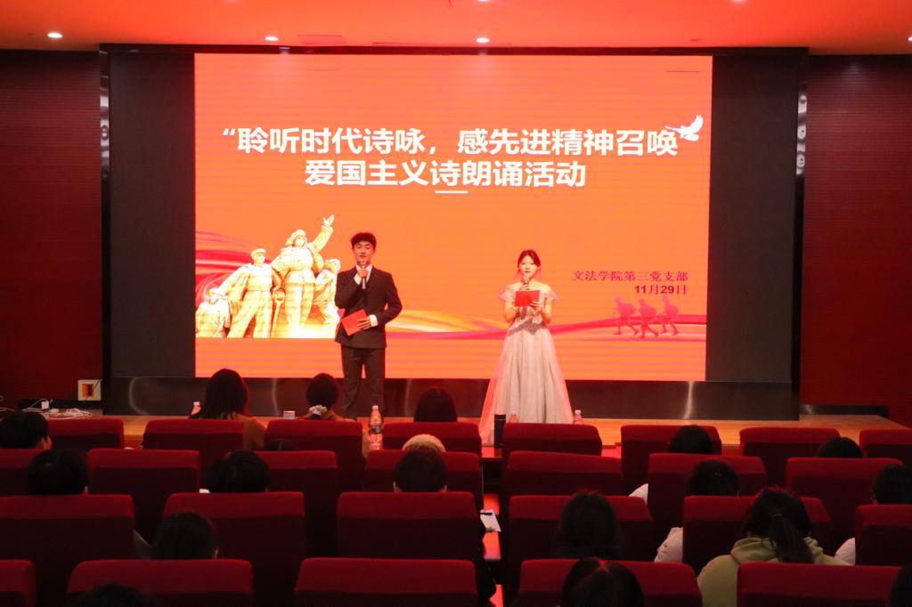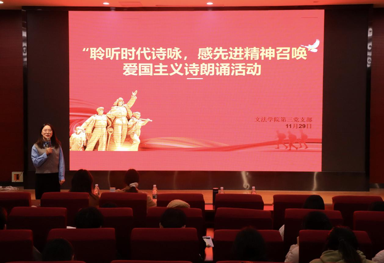 为了深入学习贯彻党的二十大三中全会精神,推动党建工作高质量发展。我院于11月29日晚在学院楼报告厅举行了一场主题为“聆听时代诗咏,感先进精神召唤”的朗诵比赛。该活动由文法学院党委主办,文法学院第三党支部承办,我院各党支部书记及党员、学生代表参加。