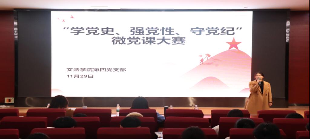 为提高党员理论水平、增强党性修养、培养学习习惯、促进党组织建设、加强党员的思想政治教育。我院于11月29日下午5点在学院楼报告厅举办“学党史,强党性,守党纪”微党课大赛。该活动由文法学院党委主办,文法学院第四党支部承办,我院各党支部书记及党员、学生代表参加。