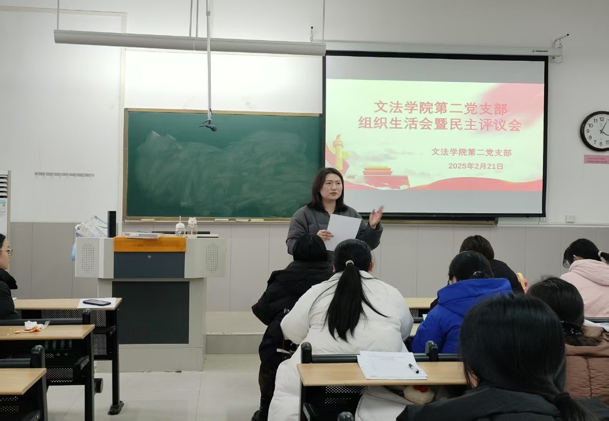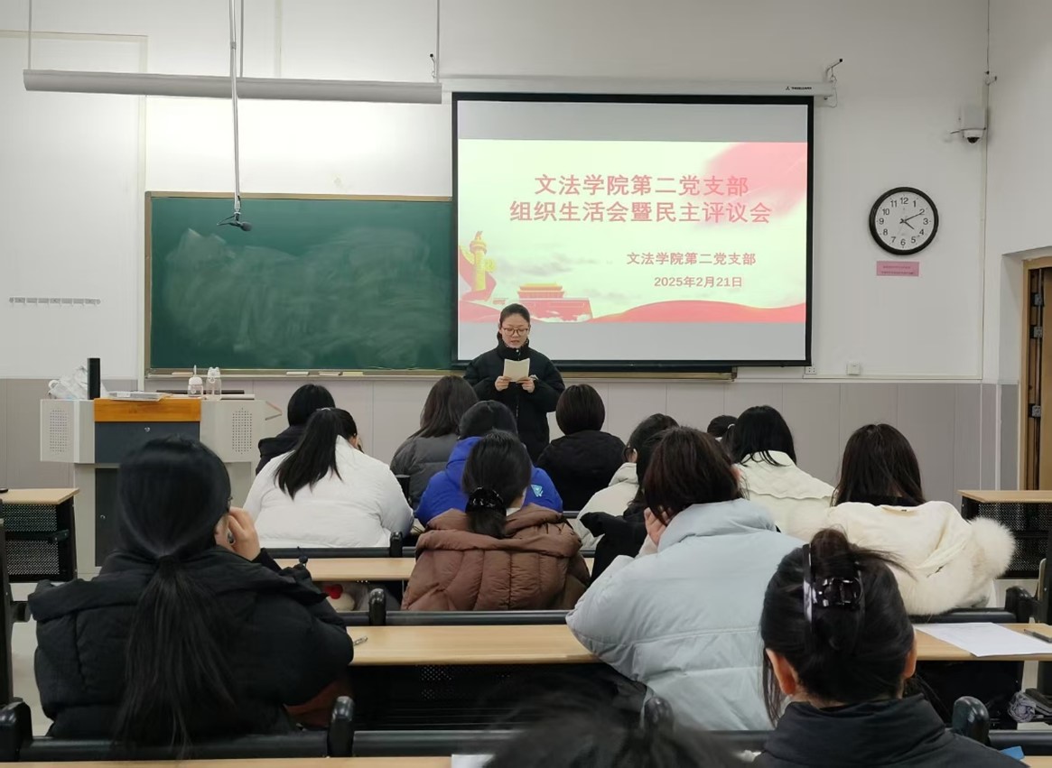 为进一步加强党组织建设,提升党员的政治素养和党性修养,增强党组织的凝聚力和战斗力。2025年2月21日下午,文法学院第二党支部在学院楼B-213召开了组织生活会暨民主评议党员大会。会议由支部书记李婉鑫同志持,第二党支部全体党员、预备党员参加了会议。
