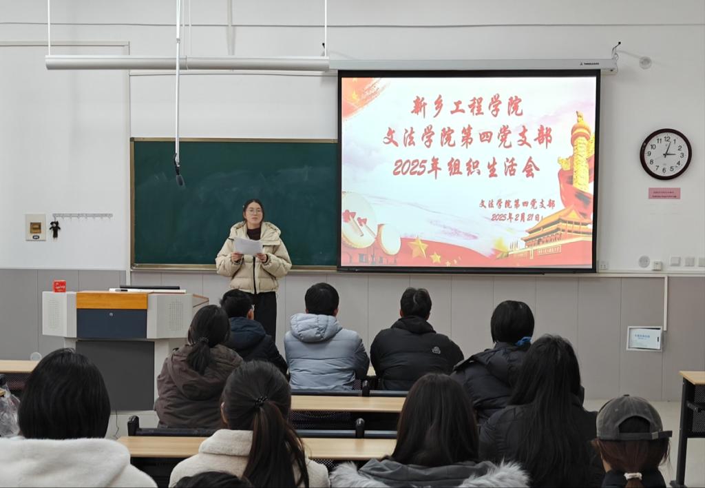 为进一步加强党组织建设,提升党员思想政治觉悟,增强党组织的凝聚力和战斗力。2025年2月21日下午,文法学院第四党支部在学院楼B-316召开了组织生活会暨民主评议党员大会。会议由支部书记吕鹏洁同志主持,第四党支部全体正式党员及预备党员参加。