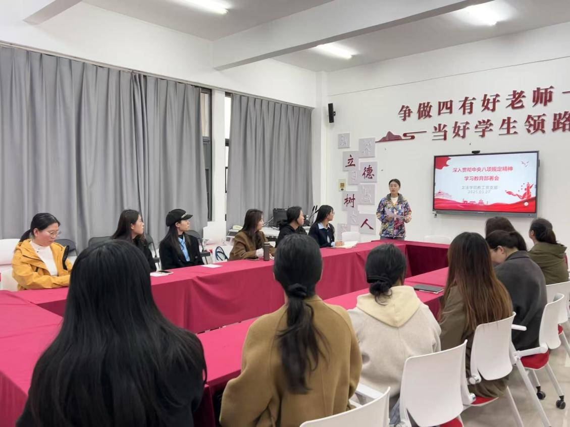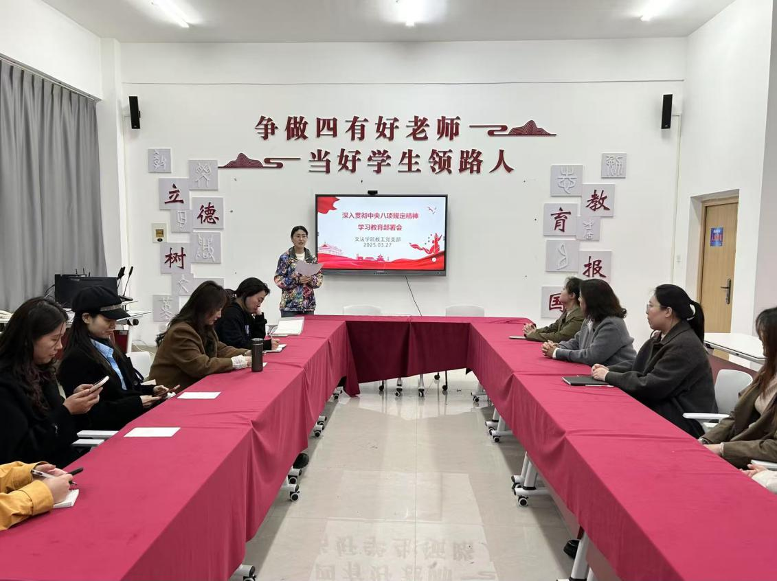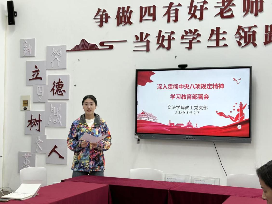 为贯彻落实党的二十届三中全会部署,巩固拓展学习贯彻习近平新时代中国特色社会主义思想主题教育成果,巩固深化党纪学习教育成果,锲而不舍落实中央八项规定精神,推进作风建设常态化长效化,3月26日下午,文法学院教工党支部于学院楼B-314召开了以深入贯彻中央八项规定精神学习教育为主题的部署会,本次会议由教工党支部组织委员李静主持,教工党支部全体党员参加。