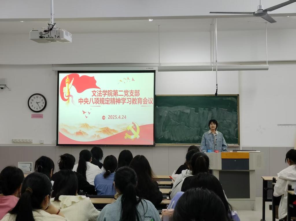 为进一步严明纪律规矩,持续深化作风建设,2025年4月24日下午,文法学院第二党支部在学院楼B207召开“深入贯彻中央八项规定精神学习教育警示”专题会议,通过政策解读、案例剖析等形式,推动全面从严治党向纵深发展。文法学院第二党支部成员全体参加。