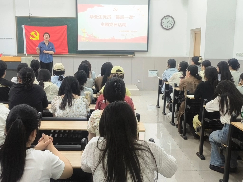 盛夏蝉鸣起,骊歌再奏响。为引导毕业生党员坚定理想信念,强化责任担当,文法第二党支部学院于2025年5月 22日在学院楼B-110开展毕业生党员“最后一课”主题教育活动。党支部书记、教师党员代表与毕业生党员齐聚一堂,共同上好离校前的党性教育“必修课”,为青春远航锚定奋进坐标。