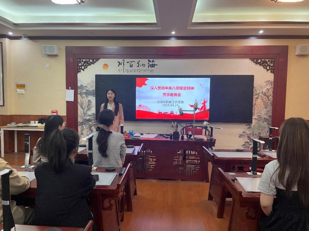 为全面贯彻落实党的二十大和二十届二中、三中全会精神,巩固拓展学习贯彻习近平新时代中国特色社会主义思想主题教育成果,深化党纪教育成果,以常态长效治理确保贯彻落实中央八项规定精神走深走实,4月24日下午,文法学院教工党支部于学院楼B-319书法实验室召开了深入贯彻中央八项规定精神警示教育会,本次会议由教工党支部组织委员李静主持,教工党支部全体党员参加。