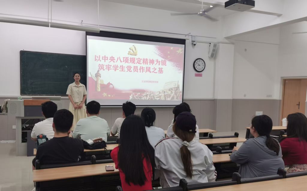 为提高党员干部知纪明纪、遵规守纪意识,文法学院第四党支部于2025年6月16日以“以中央八项规定精神为镜 筑牢学生党员作风之基”为主题在学院楼B207向支部全体党员讲授党纪学习教育专题党课。此次专题党课,吕鹏洁书记带领支部全体党员学习全面从严治党、中央八项规定精神及高质量发展等重要议题,旨在强化党员干部理论武装与作风建设,为推进中国式现代化提供思想保障。