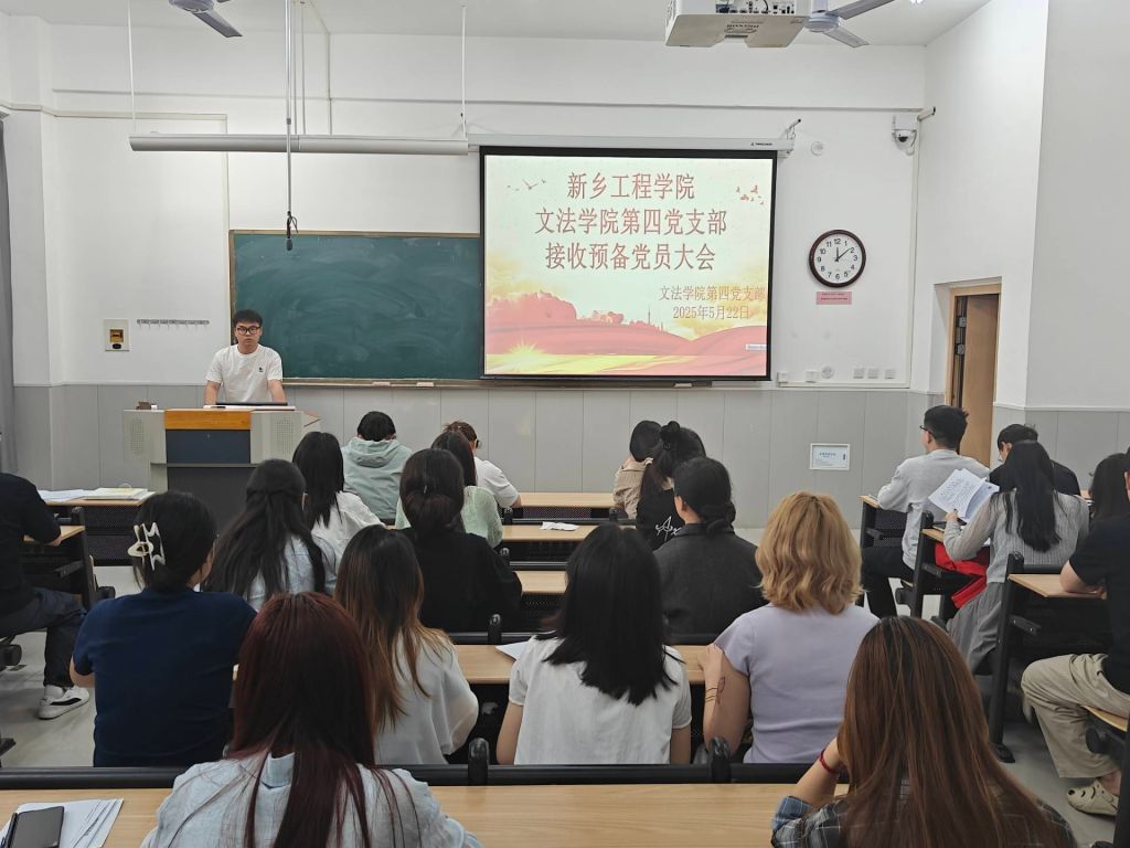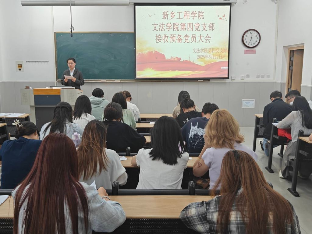 为进一步加强基层党组织建设,壮大党员队伍。文法学院第四党支部于2025年5月26日中午在学院楼B212教室召开接收预备党员大会。本次大会由张欣茹同志主持,文法学院第四党支部全体党员及预备党员参加。会议严格按照党组织接收预备党员流程进行。