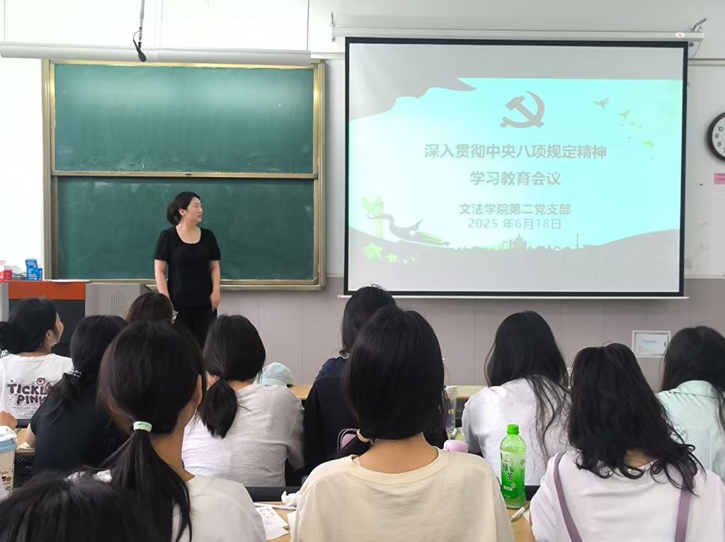 为了强化党员自我约束、自我规范,落实全面从严治党要求。文法学院第二党支部于2025年6月18日在学院楼B-104召开深入贯彻中央八项规定精神学习教育会议。此次会议由李婉鑫书记主持,全体党员参加。