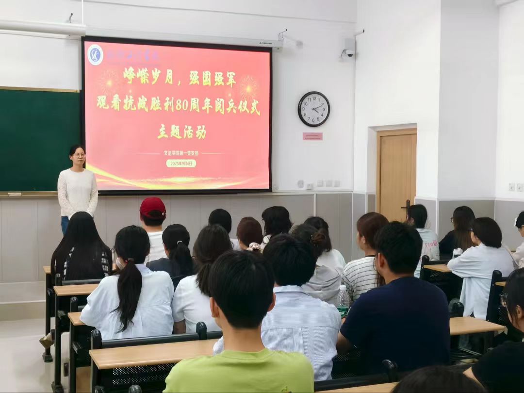 为深入学习中国人民抗日战争暨世界反法西斯战争胜利80周年大会的习近平总书记重要讲话精神,2025年9月4日,文法学院第一党支部在学院楼B316组织观看抗战胜利80周年阅兵仪式主题活动,本次活动由第一党支部教师党员李芳芳主持,第一党支部全体党员参加。