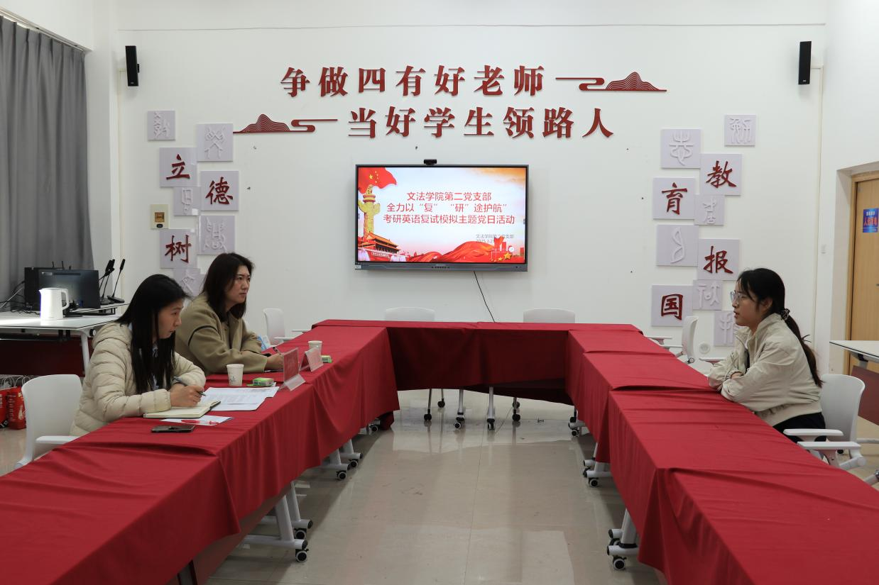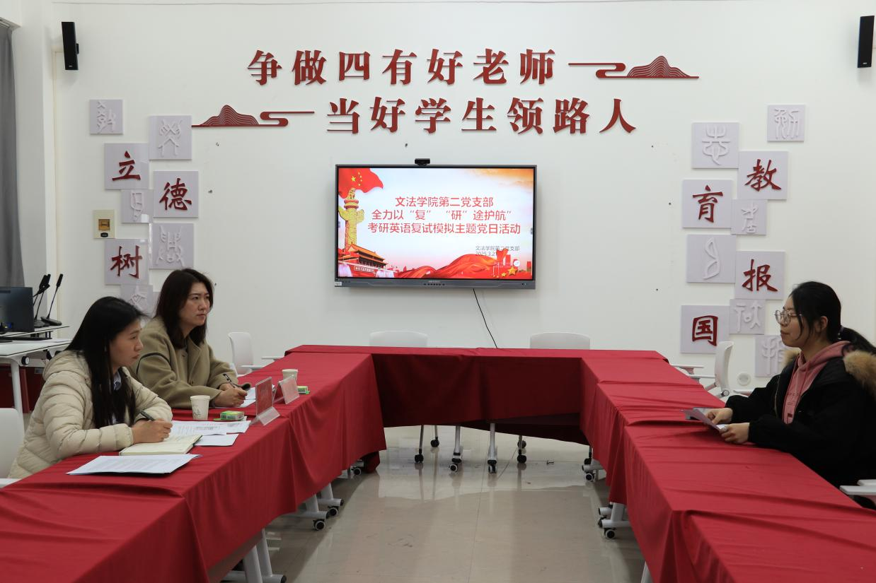 为助力考研学生提升复试英语能力,增强复试信心,文法学院第二党支部邀请外国语学院教师于3月21日上午10点在学院楼B-314开展考研英语复试模拟活动。此次活动由外国语学院专业课教师韩树月、文法学院团委书记李婉鑫担任面试考官,我院21级中文、国教专业备考考研复试的学生参与。