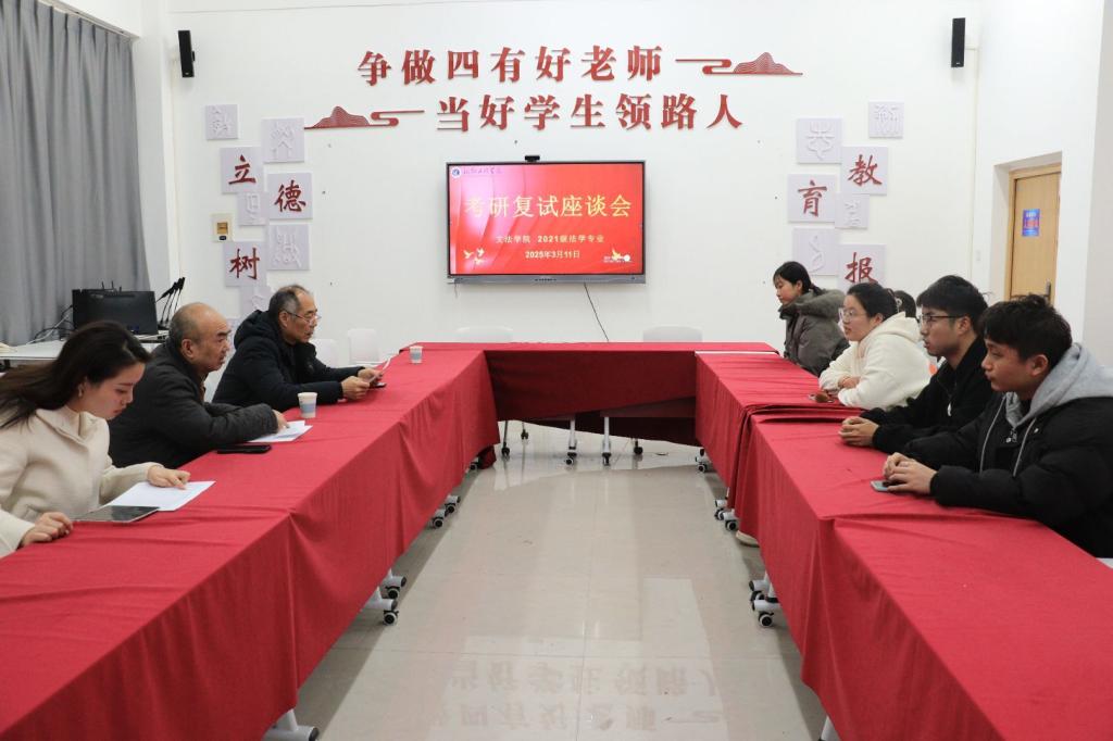 为帮助考研学子高效准备研究生复试,提高备考效率,文法学院于3月11日下午3点在学院楼B-314名师工作室召开2021级法学专业考研复试学生座谈会。本次座谈会由我院法学专业教授韦留柱、吕军书,专业课教师王宇主讲,我院备考该专业考研复试的学生参与。
