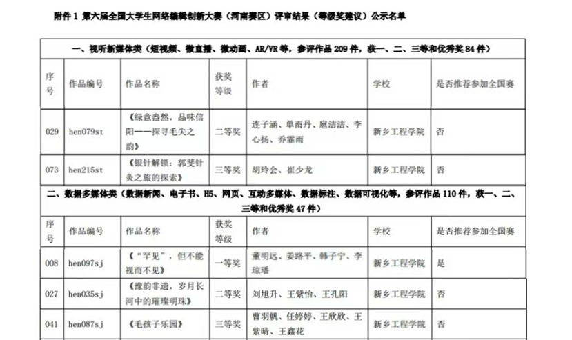 近日,随着第七届全国大学生网络编辑创新大赛河南赛圆满结束,我院新闻学专业五组学生团队在激烈的竞争中脱颖而出,荣获佳绩。其中,数据新闻作品《“罕见”,但不能视而不见》摘得一等奖桂冠,推荐进入国赛。短视频《绿意盎然,品味信阳––探寻毛尖之韵》与《豫韵非遗,岁月长河中的璀璨明珠》荣获二等奖,短视频《银针解锁:郭斐针灸之旅的探索》与数据新闻《毛孩子乐园》荣获三等奖。